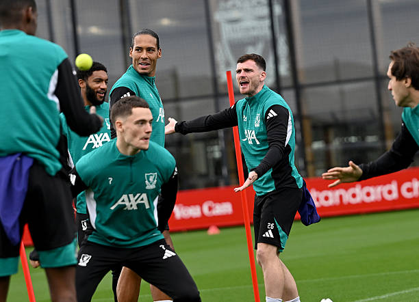부주장 앤디 로버트슨은 코디 각포와 플로리안 비르츠가 참여한 훈련 운동 중에 분명히 화가 난 폭발을 보였습니다.